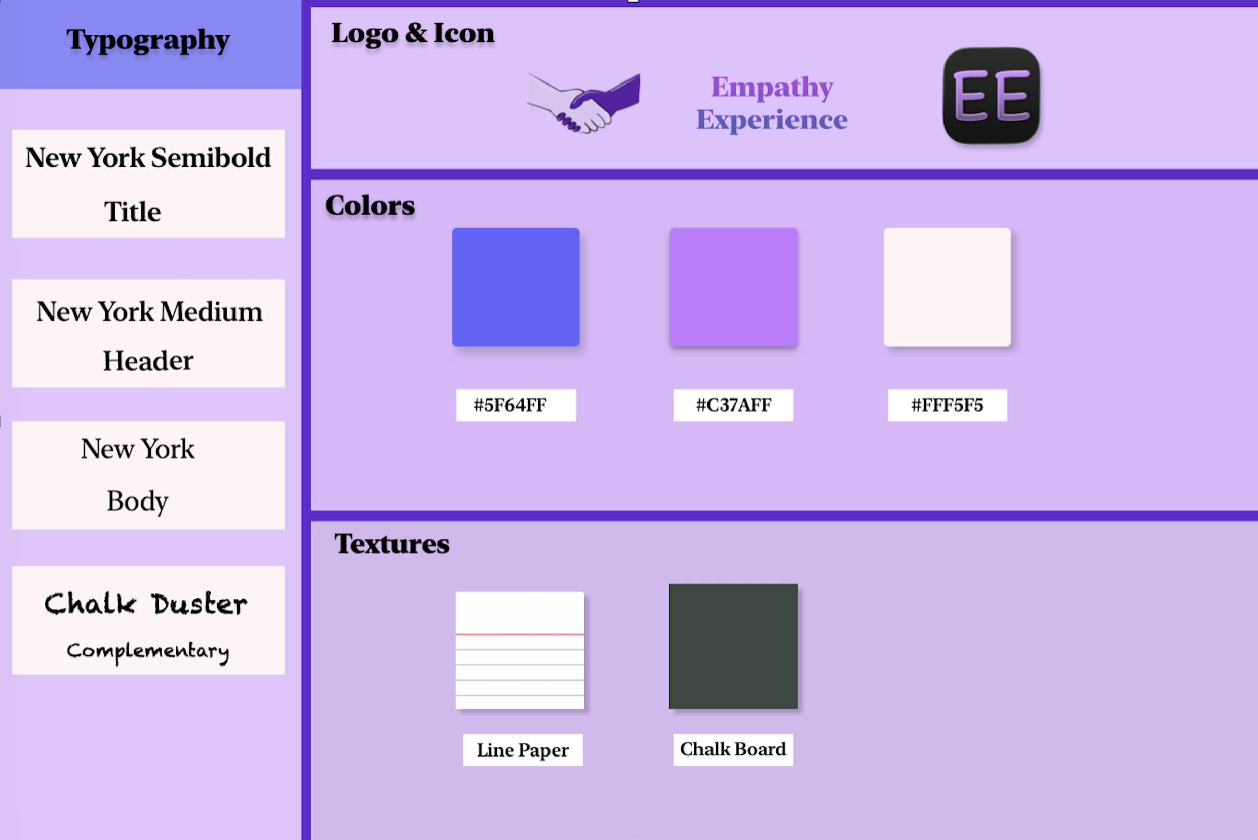 Purple and blue tones were chosen to evoke empathy, trust, and understanding reinforcing the app’s purpose of fostering meaningful reflection.